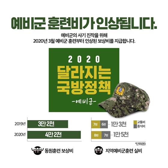 또한 일일 6시간 이상 예비군훈련에 참가한 예비군에게 급식을 지원하며 급식지원이 불가능할 경우에는 급식비를 정산하여 지급합니다. 단, 동원훈련의 경우에는 현역 장병 기준의 급식지원지침을 적용합니다.