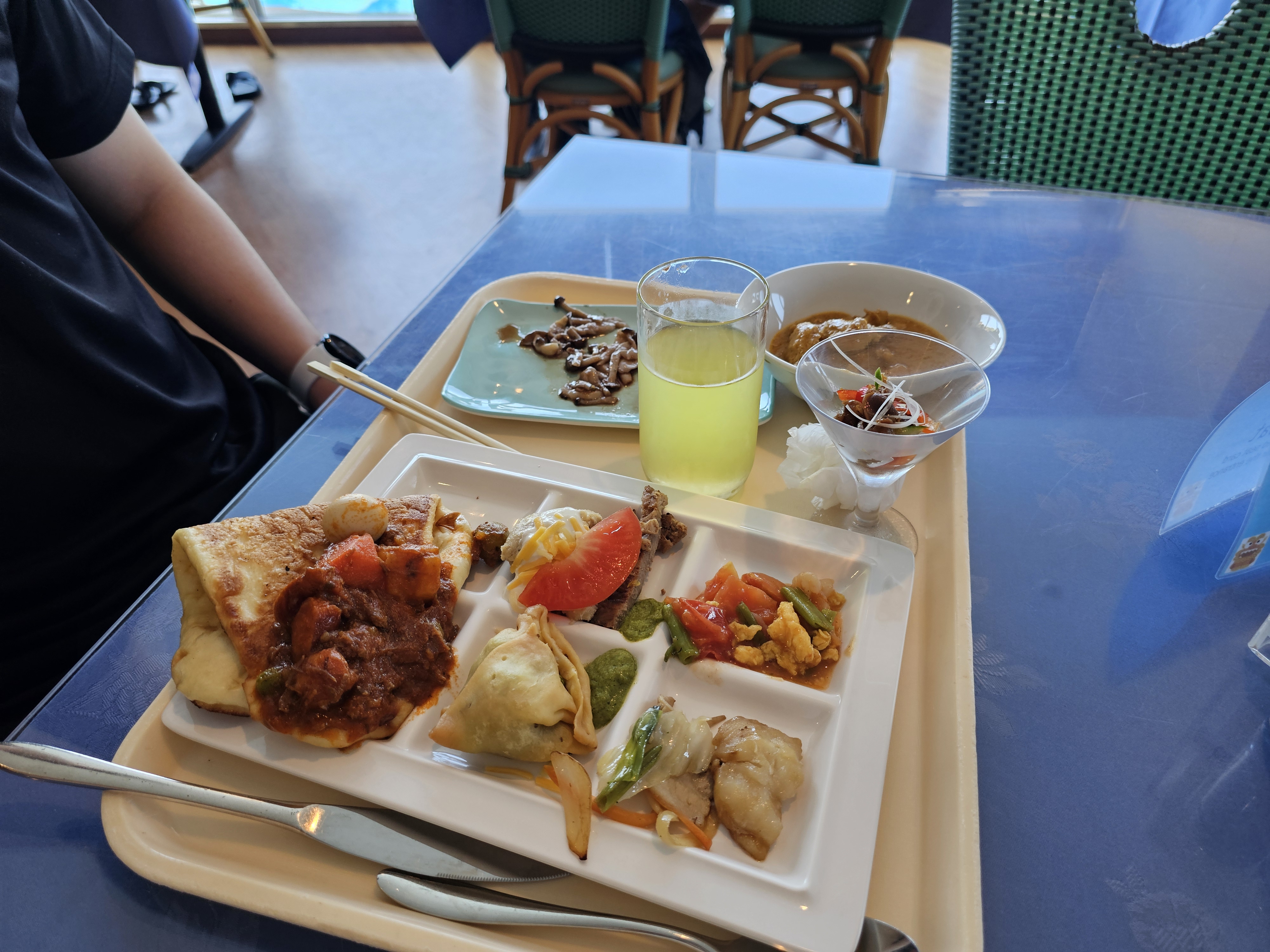 바다를 보면서 식사할 수 있는 조식 뷔페의 풍경이 정말 아름다워요. 사실 첫날까지만 해도 비바람이 몰아쳐 큰 기대를 하지 않고 있었는데 다음 날이 되자 하늘이 다시 맑아지고 더워졌어요. 10월 중순이었는데도 뙤약볕에 서 있으니 금세 새카맣게 타버릴 정도였으니까요.