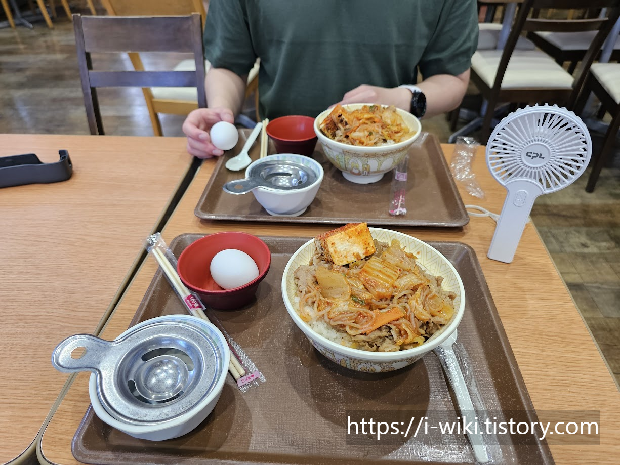 규동 사이즈랑 김치에 대해 고민하면서 메뉴를 살펴봤어요. 결국 두부와 스키야키 쇠고기 덮밥을 주문했죠. 계란을 어떻게 먹어야 할지 고민하다가 나름의 방식으로 실험해봤어요. 스키야키 소고기 덮밥 맛이 괜찮았고, 볶음김치랑도 잘 어울렸어요.